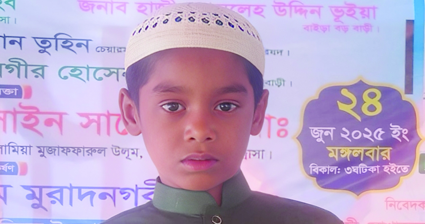কুমিল্লার মুরাদনগরে সাড়ে পাঁচ মাসেই কুরআনের হাফেজ হয়েছে সাইদুল ইসলাম নামে ৮ বছরের এক শিশু। মুরাদনগর উপজেলার বাইড়া দারুল কুরআন নুরানিয়া হাফেজিয়া মাদরাসা থেকে কুরআন মুখস্ত করে ওই শিশু শিক্ষার্থী। সে বাইড়া গ্রামের সবজি বিক্রেতা আক্কাস আলীর ছেলে।