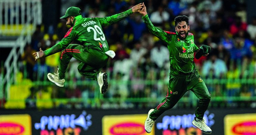 তানভীর তার ফাইফার (৫ উইকেট) পূরণ করেন মাহিশ থিকশানাকে (২) আউট করে। তবে দুনিথ লিয়ানাগে একটা প্রান্ত ধরে লড়াই চালিয়েই যেতে থাকেন। বেশ কয়েকটি জীবন পেয়ে ৭৫ বলে লড়াকু ফিফটি হাঁকান। জয়ের সুযোগ তৈরি করেছিলেন তিনিই। ৪৮তম ওভারের প্রথম বলে ছক্কা হাঁকান মোস্তাফিজকে। ১৭ বলে তখন দরকার ২১। পরের বলেই ফিজ ফিরতি ক্যাচে ফেরান লিয়ানাগেকে। নয়তো ৮৫ বলে ৭ চার আর ২ ছক্কায় তার ৭৮ রানের ইনিংসটা হয়তো লঙ্কানদের উৎসবের উপলক্ষ্য গড়ে দিতো। এরপর দুশমন্ত চামিরাকে বোল্ড করে শেষ টানেন তানজিম সাকিব। ৪৮.৫ ওভারে ২৩২ রানে অলআউট হয় শ্রীলঙ্কা।