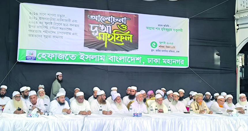 শনিবার (৫ জুলাই) রাজধানীর জামিয়া মাদানিয়া বারিধারা মিলনায়তনে শাপলা ও চব্বিশের ফ্যাসিবাদ ও আধিপত্যবাদবিরোধী গণঅভ্যুত্থানে শহীদদের রূহের মাগফিরাত ও আহতদের সুস্থতা কামনায় হেফাজতে ইসলাম বাংলাদেশ ঢাকা মহানগর আয়োজিত মাহফিলে তিনি এসব কথা বলেন।