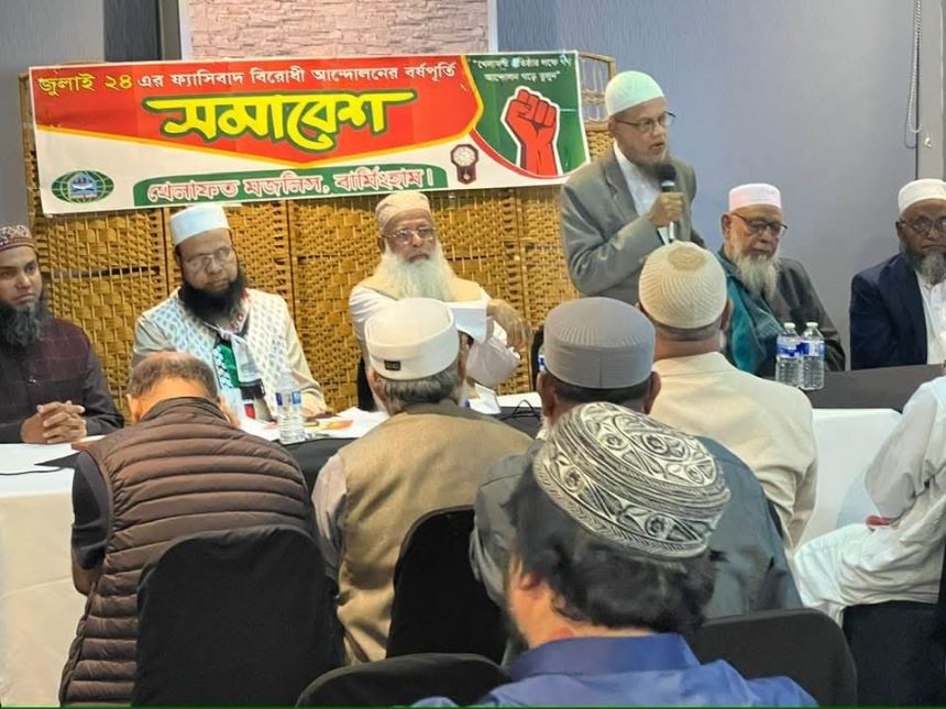 সোমবার (৪ আগস্ট) বার্মিংহামের স্মলহিত মিষ্টিদেশ রেষ্টুরেন্টে খেলাফত মজলিস বার্মিংহাম শাখার জুলাই ২৪-এর ফ‍্যাসিবাদ বিরুধী আন্দোলনের বর্ষপূর্তি সমাবেশে প্রধান অতিথির বক্তব্যে তিনি এসব কথা বলেন।