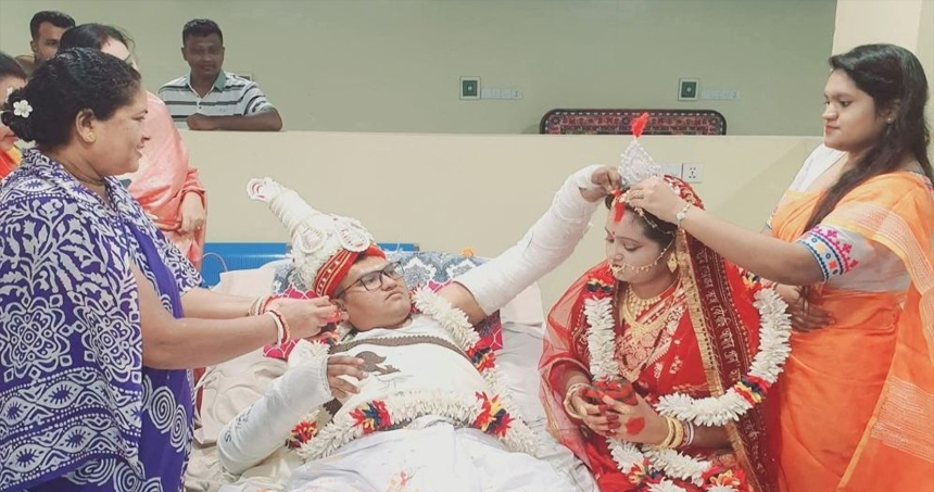 বিয়ের আয়োজন মানেই আনন্দ-উচ্ছ্বাসে সাজানো মঞ্চ, ফুলে মোড়া আসর আর অতিথির কোলাহল। কিন্তু মানিকগঞ্জে দেখা গেল একদম ভিন্ন চিত্র। দুর্ঘটনায় আহত হয়ে হাত-পায়ে ব্যান্ডেজ বেঁধে হাসপাতালে শয্যাশায়ী বর আনন্দ সাহা। তবুও থেমে থাকেনি বিয়ের জয়গান। এদিকে পূর্ব নির্ধারিত লগ্ন যেন বয়ে না যায় তাই হাসপাতালের বিছানায় বসেই সম্পন্ন হলো জীবনের সবচেয়ে স্মরণীয় দিন। এক অনন্য বিয়ের আয়োজন। মানিকগঞ্জের এই ব্যতিক্রমী বিয়ে যেন দেশের অনন্য নজির হয়ে রয়ে গেল। নেট দুনিয়াতে এই বিয়ে রীতিমতো ভাইরাল হয়ে উঠেছে।