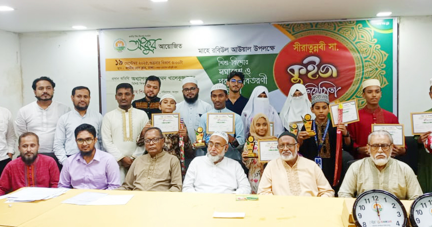 মাহে রবিউল আউয়াল উপলক্ষ্যে জাতীয় শিশু-কিশোর সংগঠন অংকুর আয়োজিত সীরাতুন্নবী সাল্লাল্লাহু আলাইহি ওয়াসাল্লাম কুইজ প্রতিযোগিতার পুরস্কার বিতরণী সম্পন্ন হয়েছে। শুক্রবার (১৯ সেপ্টেম্বর) জাতীয় প্রেস ক্লাবের জহুর হোসেন চৌধুরী হলে এ অনুষ্ঠান সম্পন্ন হয়। অনুষ্ঠানে বিজয়ী শিশু-কিশোরদের মধ্যে সনদ ও পুরস্কার বিতরণ করেন অতিথিবৃন্দ।