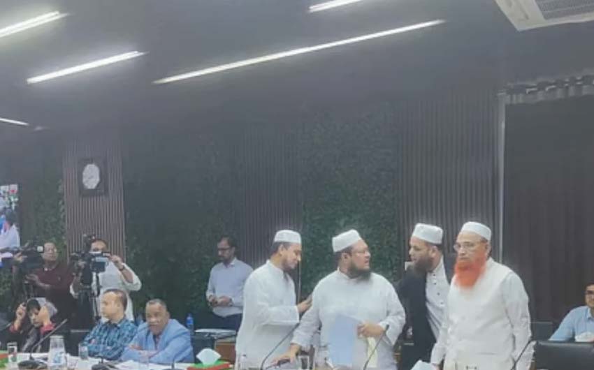 সংলাপ শুরুর কিছুক্ষণ আগে মহাসচিব মুফতি সাখাওয়াত হোসেন রাজির নেতৃত্বে একটি প্রতিনিধি দল হলে ঢোকে। এরই মধ্যে সেখানে উপস্থিত ছিলেন হাসানাত আমিনীর নেতৃত্বাধীন অংশের প্রতিনিধিরা। প্রবেশ করেই রাজি অভিযোগ করেন, আমিনীর অনুসারীরা ‘ফ্যাসিবাদের দোসর’। তাঁর ভাষায়, ‘তারা বিগত নির্বাচনে ফ্যাসিবাদকে বৈধতা দিয়েছে, তাই তারা থাকলে আমরা সংলাপে অংশ নেব না।’