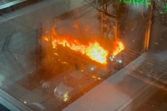 রাজধানীর ধানমণ্ডিতে ল্যাবএইড হাসপাতালের সামনে বাসে আগুন