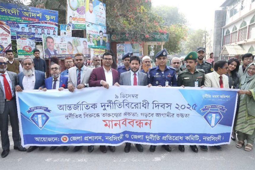 নরসিংদীতে বিভিন্ন কর্মসূচির মধ্য দিয়ে আন্তর্জাতিক দুর্নীতি বিরোধী দিবস ২০২৫ পালিত হয়েছে। এ বছরের প্রতিপাদ্য ছিল— “দুর্নীতির বিরুদ্ধে তারুণ্যের একতা : গড়বে আগামীর শুদ্ধতা।”