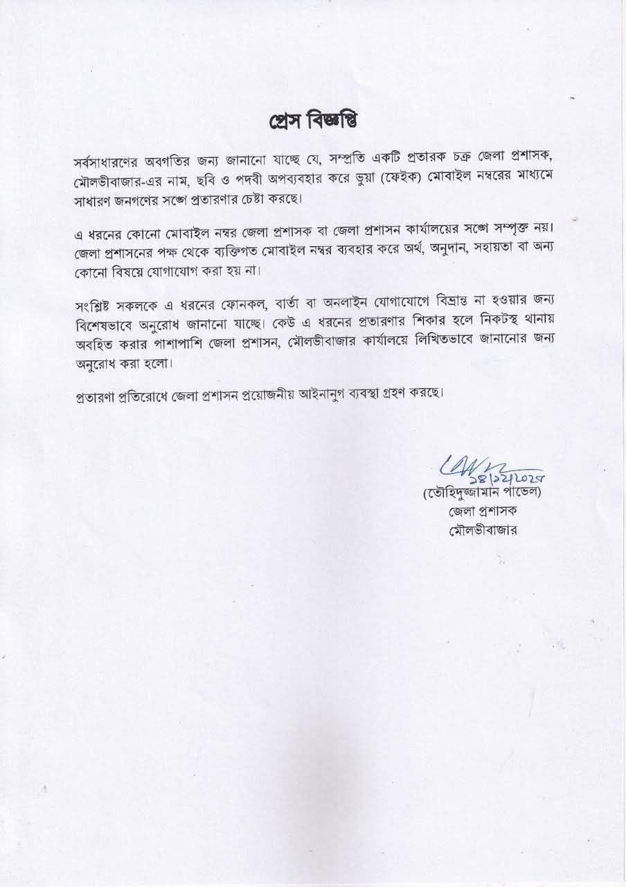 যদি কেউ এ ধরনের প্রতারণার শিকার হন, তবে নিকটস্থ থানায় অবহিত করার পাশাপাশি জেলা প্রশাসন,মৌলভীবাজার লিখিতভাবে জানানোর অনুরোধ করা হয়েছে।