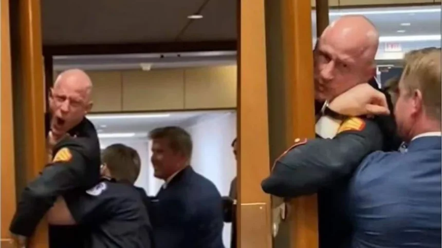 হঠাৎ দাঁড়িয়ে ম্যাকগিনিস বলেন, ‘চলমান যুদ্ধের জন্য ইসরায়েল দায়ী।’ এরপর নিরাপত্তাকর্মীরা তাকে কক্ষ থেকে সরিয়ে নেওয়ার চেষ্টা করলে পরিস্থিতি উত্তপ্ত হয়ে ওঠে।