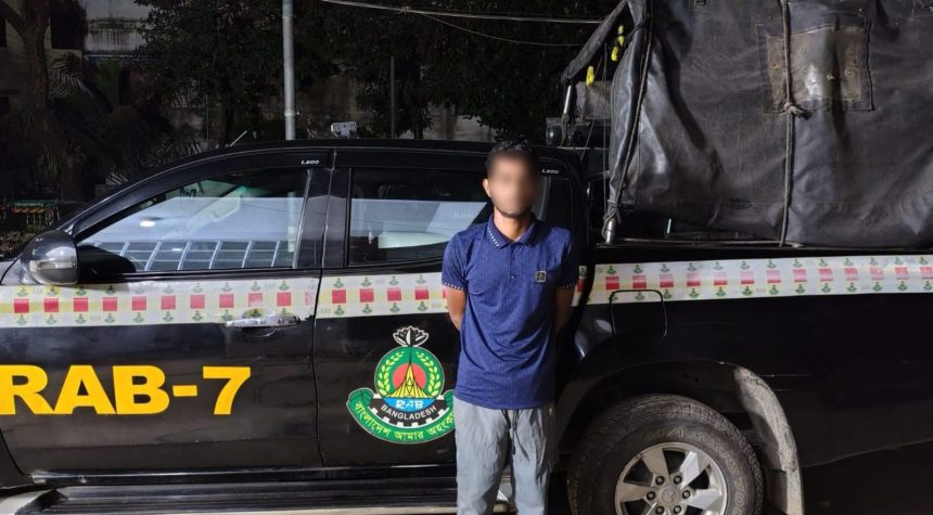 র‍্যাব-৯ ও র‍্যাব-৭-এর যৌথ অভিযানে শনিবার (১৮ এপ্রিল) রাতে চট্টগ্রামের মিরসরাই থানার মিঠাছড়া বাজার এলাকা থেকে তাকে গ্রেপ্তার করা হয়। গ্রেপ্তার হওয়া আসামি মো. নাসির (২৫)। তিনি হবিগঞ্জের মাধবপুর উপজেলার তেলিয়াপাড়া এলাকার বাসিন্দা।